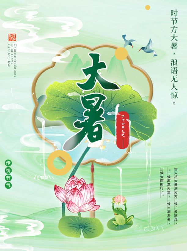 大暑是二十四节气中的第十二个节气,也是夏季最后一个节气。斗指未,太阳黄经为120°,于公历7月22日-24日交节。