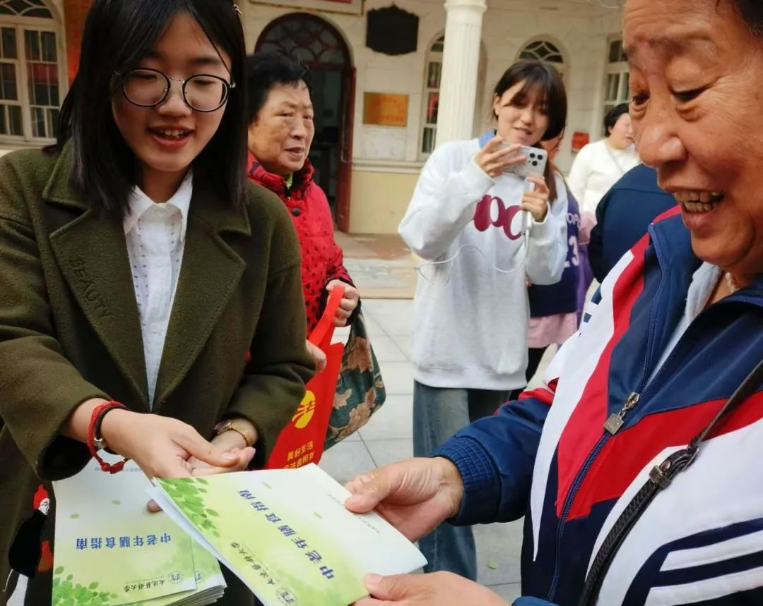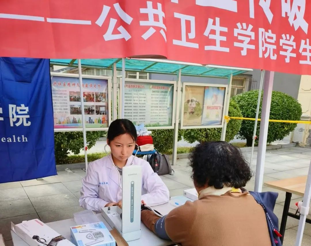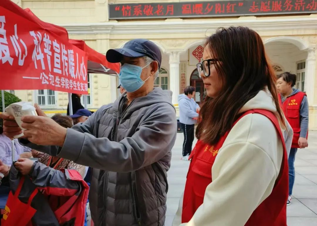活动现场,学生党员为社区的老人们测量了血压和体脂,并耐心地提醒他们要注意饮食健康和适度运动。同时还分发了中老年膳食指南,向他们普及健康的生活方式。