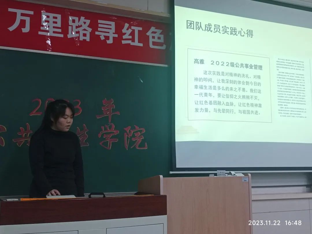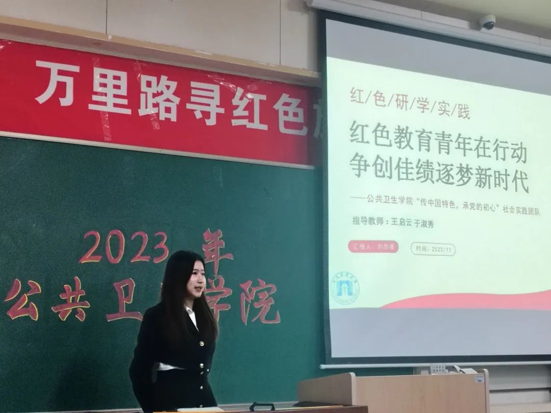 红色研学实践团队队员刘雨珊同学对“传中国特色,承党的初心”队组的实践结果进行了展示汇报。团队前期通过对高校学生的问卷调查和数据分析,调查了人群对党史知识和文化常识的了解现状以确定实践目的,随后走进陕西省,河南省,辽宁省,贵州省,河北省五省纪念馆和博物馆,实地考察感受。交流总结了党的伟大革命精神,学习体悟了中华优秀历史文化,深切感受到了今天和平安宁的来之不易,更加坚定自己肩上的责任和使命,也深刻领悟到了青年是新时代的奋斗主力军,不仅要赓续传统文化,也要不忘初心。实践成员许下了作为新时代接班人“不忘初心,牢记抗战英雄丰功伟绩”的铮铮誓言。