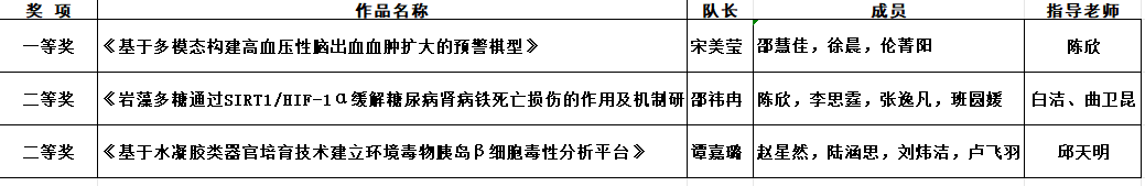 此次复赛前,学院组织校内外专家为三支参赛队伍精心打磨作品,做了充分准备。经过激烈角逐,最终开云官网三支参赛队伍在预防医学赛道复赛中取得了参赛历史以来的最好成绩,获得一等奖1项、二等奖2项。由陈欣副院长指导的22级公共事业管理专业宋美莹团队申报的作品《基于多模态构建高血压性脑出血血肿扩大的预警模型》荣获预防医学赛道复赛一等奖,由白洁老师指导的21级预防医学专业邵祎冉团队申报的作品《岩藻多糖通过SIRT1/HIF-1α缓解糖尿病肾病铁死亡损伤的作用及机制研究》获得了预防医学赛道复赛二等奖,由邱天明老师指导的21级预防医学专业谭嘉璐团队申报的作品《基于水凝胶类器官培育技术建立环境毒物胰岛β细胞毒性分析平台》获得了预防医学赛道复赛二等奖。这一系列成绩的取得,彰显了开云官网师生在预防医学领域的实验设计水平与创新能力,标志着学院教育教学与科研能力的进一步提升。接下来,开云官网将继续打磨参赛作品,力争在即将于8月举行的全国总决赛中取得更好的成绩。
