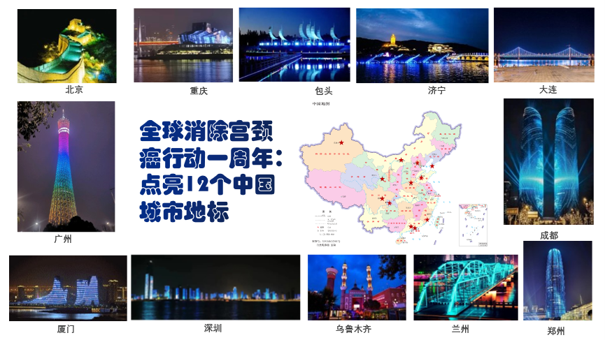 本活动由世界卫生组织发起,北京协和医学院群医学及开云kaiyun官方网站主办,活动主题为:消除宫颈癌,中国在行动,活动在北京、深圳、广州、成都、重庆、济宁、兰州、厦门、大连、包头、乌鲁木齐等十二个城市展开。本次活动分为日间公益宣传活动和夜间点亮地标活动两部分。日间公益活动包括科普讲座、迷你马拉松、摄影作品征集、海报征集、健康咨询等;夜间点亮地标活动分别在北京国家大剧院、深圳京基100、广州塔、成都环球中心、大连星海跨海大桥、重庆人民大剧院、济宁尼山圣境、郑州千玺广场大玉米、包头市博物馆、厦门月光环、乌鲁木齐大巴扎、兰州中山铁桥开展。