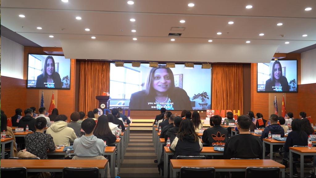 典礼伊始,现场播放了美国班尼迪克大学的学校宣传片及美方科学与健康学院院长Cheryl Mascarenhas的寄语视频,展现了中美合作MPH项目国际合作的深厚背景和对新生的美好祝愿。