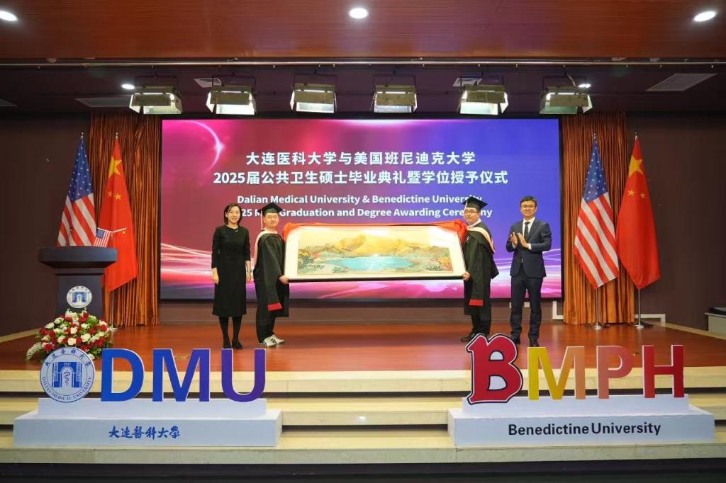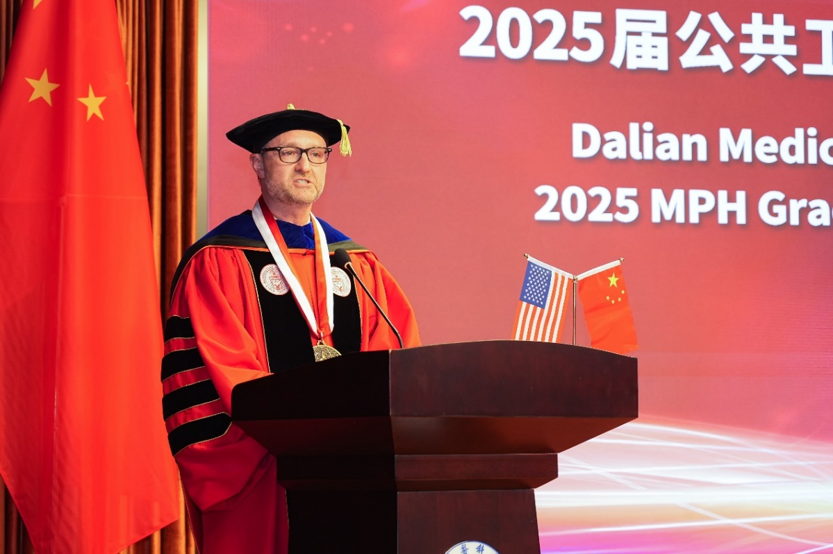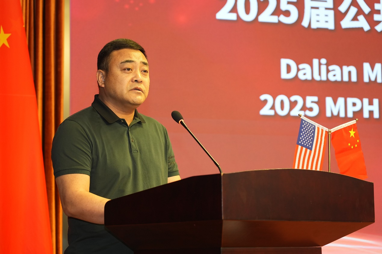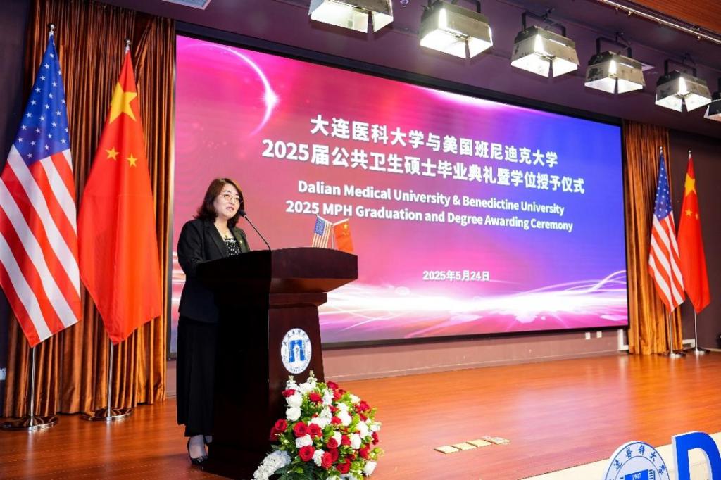 优秀校友代表、大连市第七人民医院老年病房主任姚烨发言。他向毕业生致以祝贺,并回顾了在MPH项目课程学习与学术讨论的收获,强调公卫人需牢记使命、投身实践。他结合工作经验提出三点建议:保持学习、注重合作、敢于探索。他寄语毕业生将毕业视为新起点,牢记公卫人的使命责任,在各自领域拼搏奋斗。最后,他祝福大连医科大学与美国班尼迪克大学发展蒸蒸日上,师生皆展美好前程。