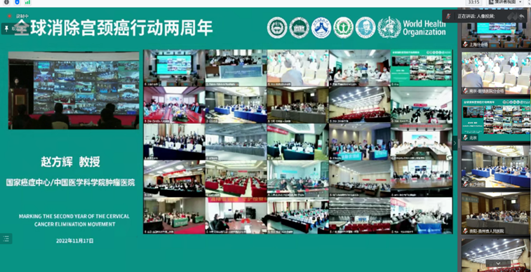 17日上午,北京主会场与全国30个分会场视频连线开展活动,北京主会场由赵方辉教授主持,各位领导与嘉宾致辞。会上,乔友林教授对WHO全球消除子宫颈癌两周年活动进行简明的介绍;郎景和院士讲述了中国宫颈癌的消除之路。各位领导教授的发言高屋建瓴,总揽全局,增强了消除宫颈癌的信心和底气。