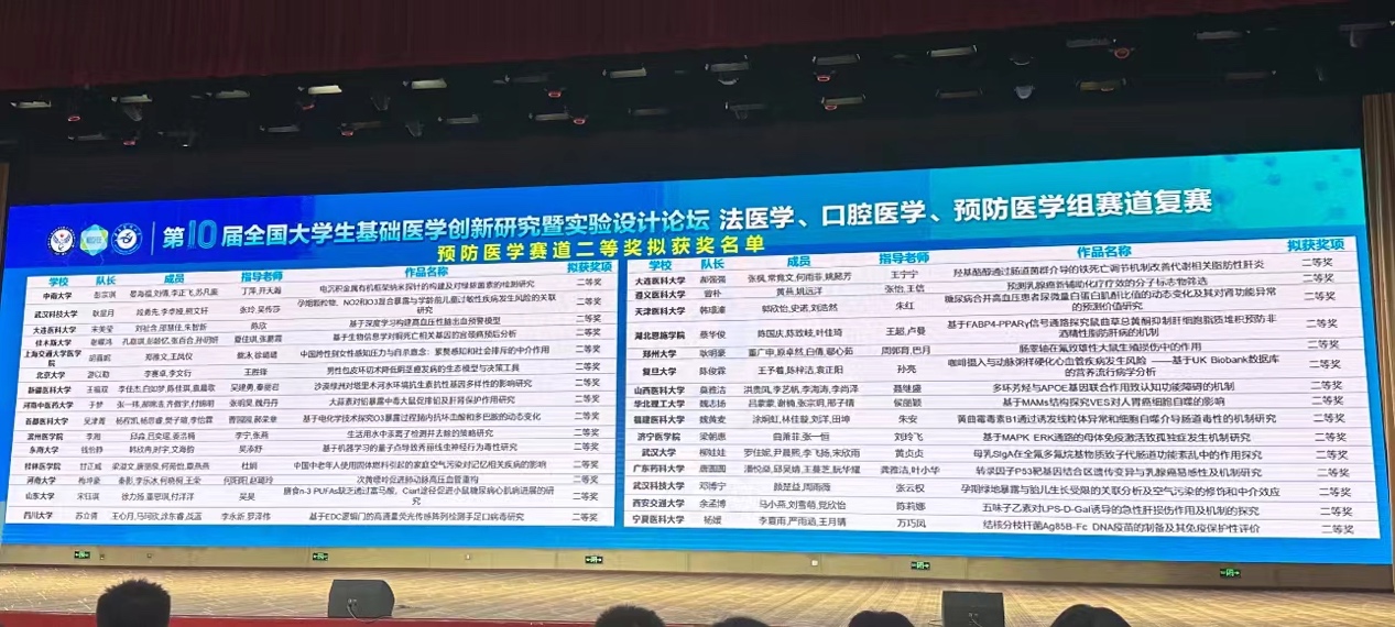 2024 年 7 月 20 日,在遵义医科大学召开的“第10届全国大学生基础医学创新研究暨实验设计论坛”本科院校组复赛中,开云官网师生取得了令人振奋的成绩。由陈欣副院长和王宁宁老师分别指导的学生团队,在预防医学赛道中均荣获二等奖。这是开云官网教师在此项全国性赛事中的重大突破,标志着开云官网师生在基础医学领域的创新研究和实验设计方面又迈上了新的台阶。
