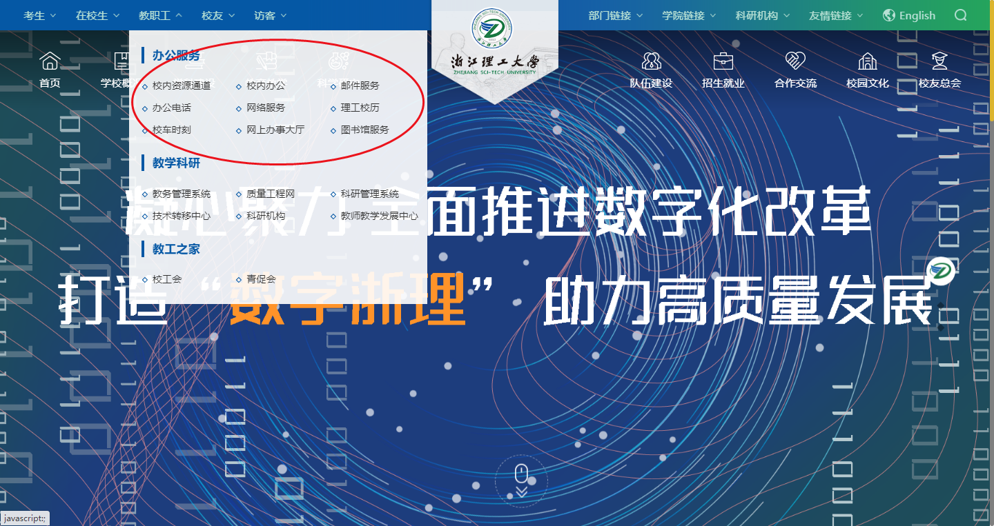 各位师生常用的校内资源(VPN通道)、网上办事大厅、图书馆服务、邮件服务、新闻资讯等已整合在了主页面的“智慧浙理E-zstu”板块,实现了“一站式”服务。如下图所示: