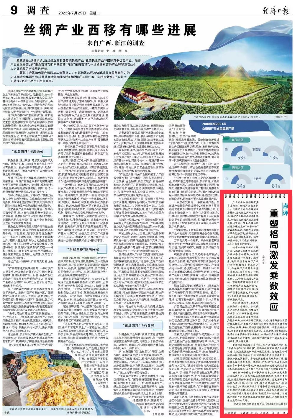 要更好发挥政府引导作用。以广西河池市为例,从“东桑西移”到“东绸西移”,河池市抢抓茧丝绸产业转移机遇,实现当地茧丝绸产业跨越式发展。河池还主动对接浙江湖州等东部地区,对战略转移的企业尤其是中小企业加强政策扶持。当地还注重营造良好产业环境,提供技术改造资金支持。这些年,广西、四川、云南等地相继出台配套政策和措施,调动龙头企业投资建设优质茧丝基地的积极性,大大提升了我国丝绸产业综合竞争力。